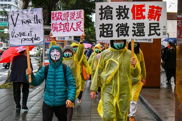 「廢掉國稅局!」「超徵還民天經地義!」「還我轉型正義!」台灣黃背心運動今(27日)天突襲財政部,雖然天候不佳,仍有逾千名眾頂著寒風細雨,在財政部前吶喊,要求部長蘇建榮出面接受陳情,並怒批財稅施政犯了五大罪狀,包括:一、超徵五千億不還人民;二、違法編列獎金,涉及圖利;三、侵害人權,提訴願先繳一半稅額才能免除強制執行;四、濫用解釋函令課稅;五、違法製造萬年稅單。