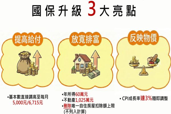 行政院會今(22)天通過衛福部擬之「國民年金法」部分條文修正草案。現行老年年金A式與基本保證、遺屬年金,將調高最低給付的基本數額由現在每月4,049元調高至5,000元,身障者為6,715元,並新增隨同消費者物價指數(CPI)3%調整,及放寬排富標準等。