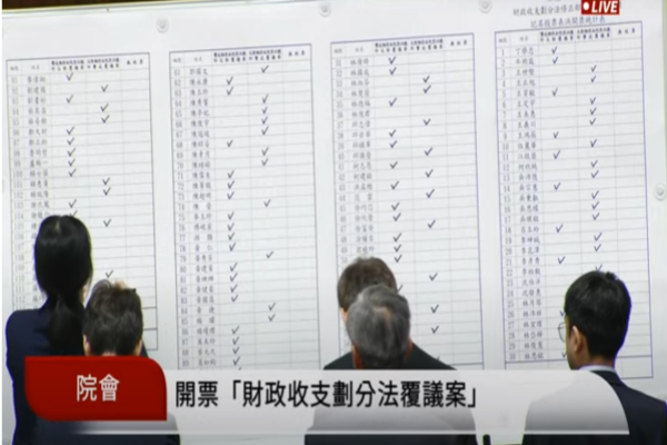 行政院針對三讀修正財政收支劃分法部分條文提出覆議案,立法院5日進行記名投票表決,藍白立委在人數優勢下,覆議案以59票反對、50票贊成,財劃法覆議案遭到否決。