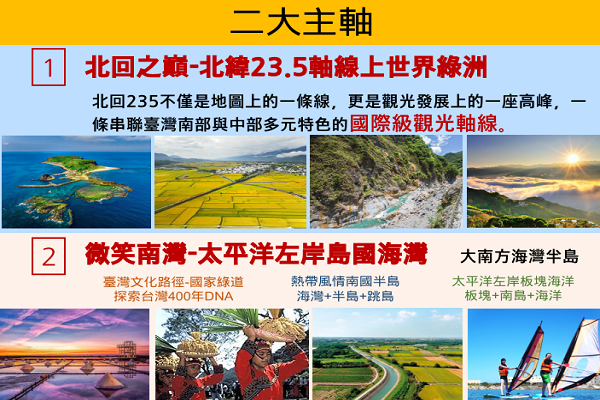 行政院長卓榮泰今天(6日)在行政院會,聽取交通部「北回之巔旗艦計畫-微笑南灣IN台灣計畫」報告後表示,預計將於2026至2029年投入新台幣100.14億元,透過「北回之巔」和「微笑南灣」2主軸,以10個亮點計畫推動觀光,形塑北回歸線帶狀旅遊,具國際吸引力的觀光地標軸線,預期所帶動的國旅效益...