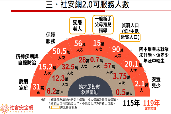 行政院長卓榮泰今天(18日)於行政院會,聽取衛生福利部「115-119年推動強化社會安全網計畫2.0」報告後表示,預計未來5年將投入新台幣819.6億元,同時根據規畫共有6大策略,將強化獨居老人訪視,提供新手父母育兒指導,照顧近貧人口等,都納入前端初級預防服務對象。並將充實專業服務人力至9,...