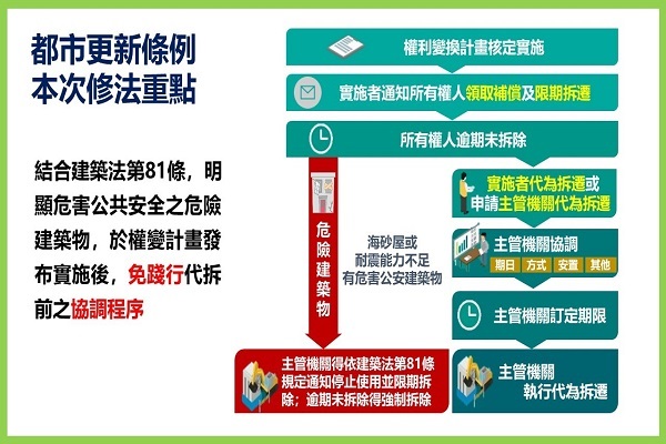 立法院院會14日三讀通過《都市更新條例》部分條文修正案,未來都更案內的危險建築物,在取得所有權人絕大多數共識,並有完善安置的配套前提下,可免除地方政府代為拆除的協調程序,能直接進行拆除;同時,為加速都更重建,並提高建築物容積獎勵誘因,最高可達原容積1.3倍。