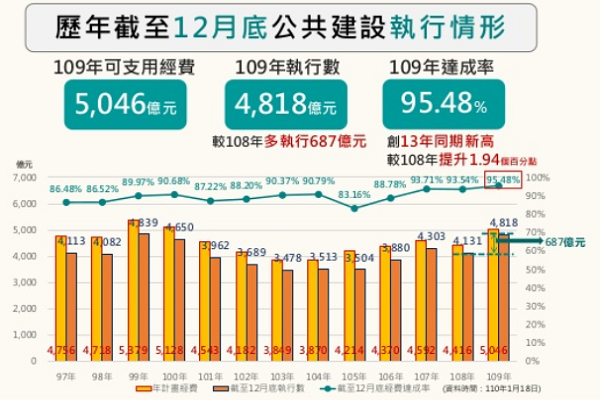 國發會今(28)日表示, 109年度整體公共建設計畫總金額為5046億元,執行率高達95.48%,創下13年來新高。今(110)年整體公共建設預算更創下史上新高,逾6100億元。