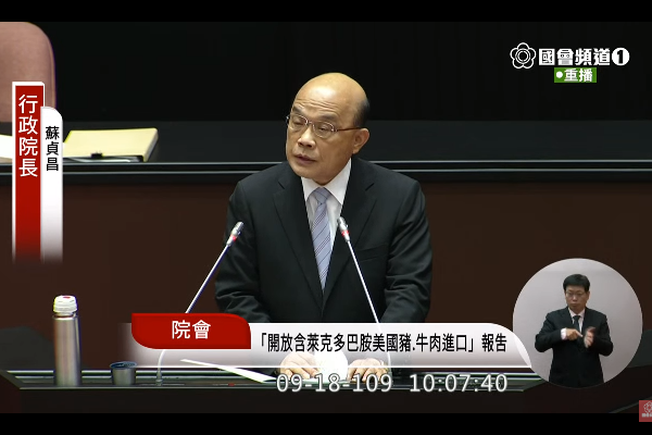 行政院長蘇貞昌18日赴立法院針對放寬美豬、美牛進口政策進行專案報告。蘇貞昌在報告中指出,未來開美豬、美牛進口,政府一定會做好食安把關、落實標章標示;並強調這是一個可以讓台灣走出去的決定,只有跟國際接軌,減少貿易障礙,才能讓產品更具競爭力,台灣應要勇敢踏出這關鍵一步。