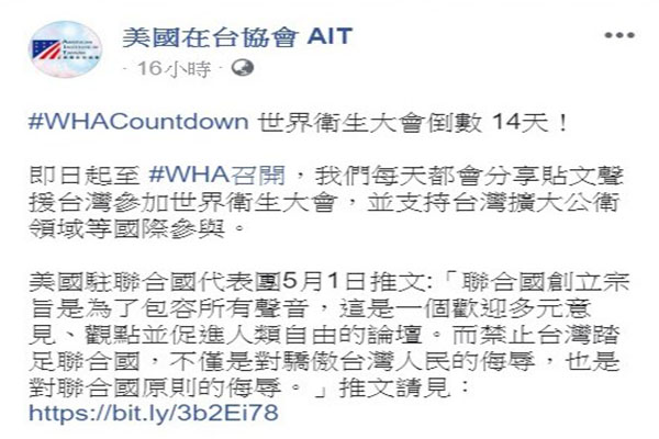 今年世界衛生大會(WHA)將於5月18日和19日舉行。外交部表示,台灣今年受邀的機率仍不大,但會努力爭取到最後。美國在台協會(AIT)1日表示,為聲援台灣參加WHA,將每天於臉書發布「#世界衛生大會倒數計時」(#WHACountdown)系列貼文。