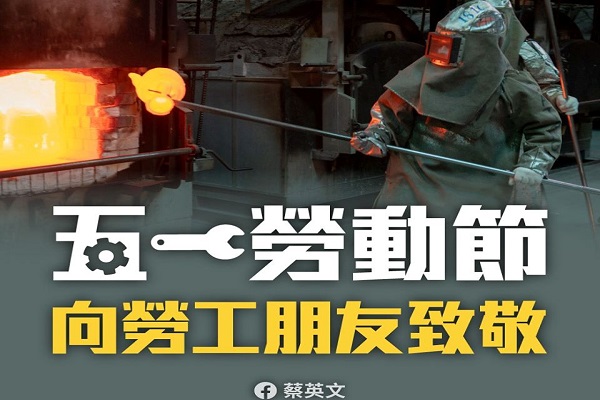 蔡總統1日在臉書發文表示,今天是五一勞動節,這段時間,謝謝勞工朋友們在不同的崗位上各司其職,...
