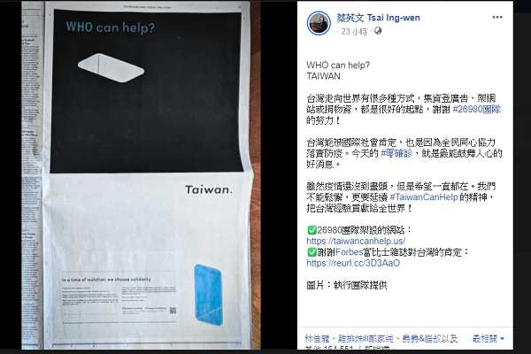 總統蔡英文15日在臉書貼出網紅阿滴與知名設計師聶永真等人募資買下《紐約時報》廣告的照片。總統表示,台灣走向世界有多種方式,集資登廣告、架網站或捐物資,都是很好的起點,疫情還沒到盡頭,但是希望一直都在,我們不能鬆懈,更要延續Taiwan Can Help的精神,把台灣經驗貢獻給全世界。...