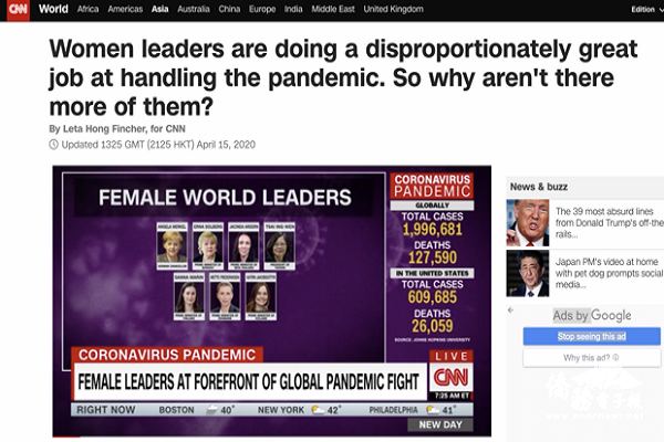 美國有線電視新聞網(CNN)15日以女力抗疫為題指出,台灣、德國與紐西蘭防疫表現受到全球的肯定。這三個國家均為女性領導者,文中提到,全球女性執政者不到7%,這些抗疫表現出色的女領導者值得被關注,這則新聞登上CNN首頁。