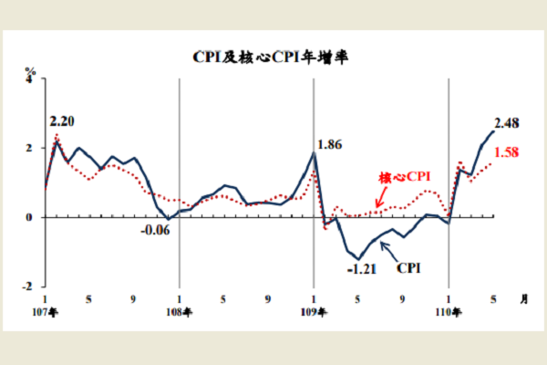 5月CPI年漲2.48%,主因油料費及旅遊服務相關價格因去年受疫情影響,比較基數低,加上機票、蔬菜、水果、蛋類及成衣價格上漲所致,惟通訊設備價格下跌,...