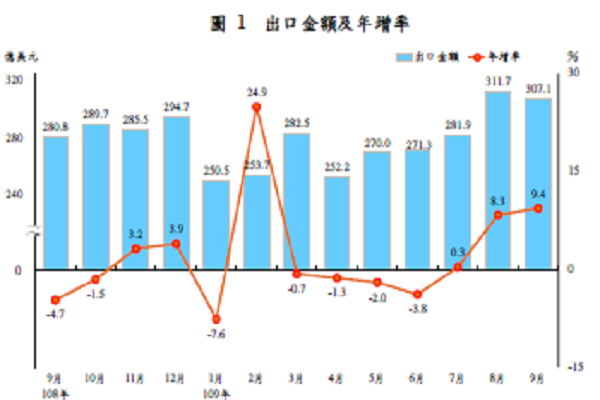 財政部7日公布9月海關進出口貿易統計,受陸商提前拉貨效應持續挹注,遠距商機及新興科技應用需求力道不減,加以消費性電子新品相繼推出,9月出口307.1億美元,為歷年單月次高,年增9.4%。