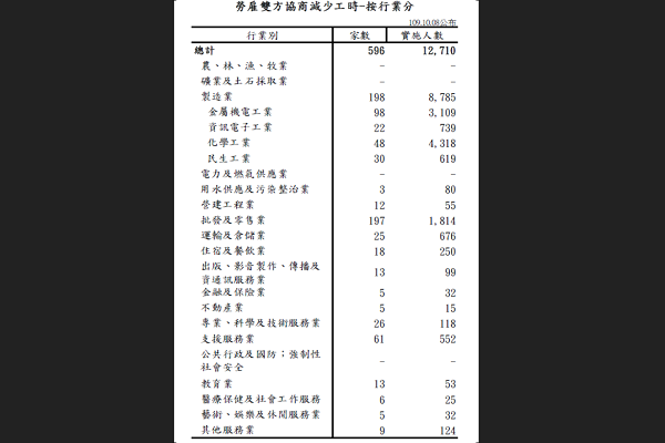 勞動部8日發布最新減班休息(俗稱無薪假)統計,實施無薪假有596家、12,710人,一週之內減338家、5,277人,減幅達三成,為疫情以來最大減幅,各業無薪假情勢趨緩,減少主要集中在製造業、批發零售業以及運輸倉儲業。
