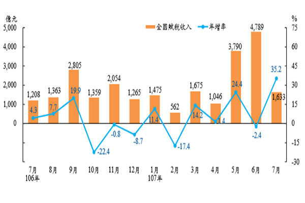 財政部9日公布7月稅收,實徵淨額1,633億元,較去年同期增加35.2%、425億;累計前7月稅收達1兆4,970億元,年增9.5%,創歷年同期新高,主因來自包括綜所稅、營所稅、營業稅、菸酒稅、房屋稅及使用牌照稅等6大稅目均創歷年同期新高。