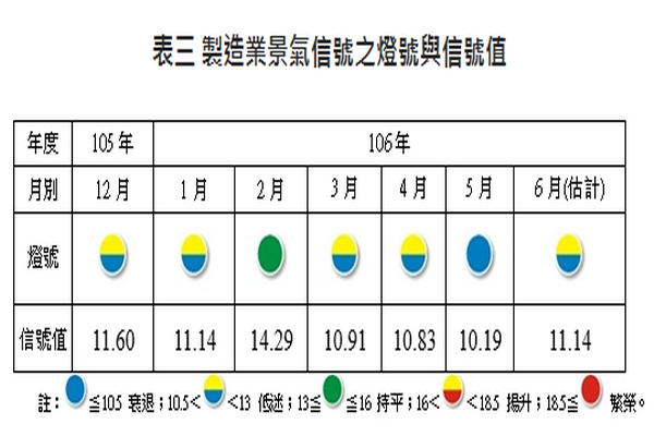 台灣經濟研究院28日公布6月製造業景氣信號值由5月的10.19分增加0.95分至11.14分,燈號由衰退的藍燈轉為低迷的黃藍燈。不過,6月呈現黃藍燈的產業比重仍超過5成,顯示大多數的產業仍處於低迷的態勢。