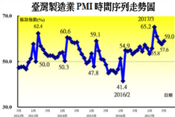 中華經濟研究院發布7月臺灣製造業採購經理人指數(PMI)在連續3個月擴張速度趨緩後,指數回升1.4%至59.0%。五項組成指標中,新增訂單、生產數量與人力僱用與現有原物料存貨水準持續呈現擴張,供應商交貨時間為上升。
